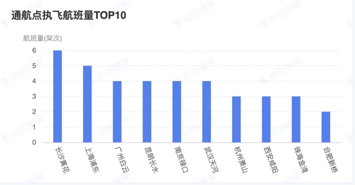 其中,海口飞往长沙的航班量最多,达到6班;其次是海口飞往上海浦东(5班),海口飞往广州,昆明,南京和武汉均为4班,海口飞往杭州,西安和珠海分别3班,海口飞往合肥有2班。