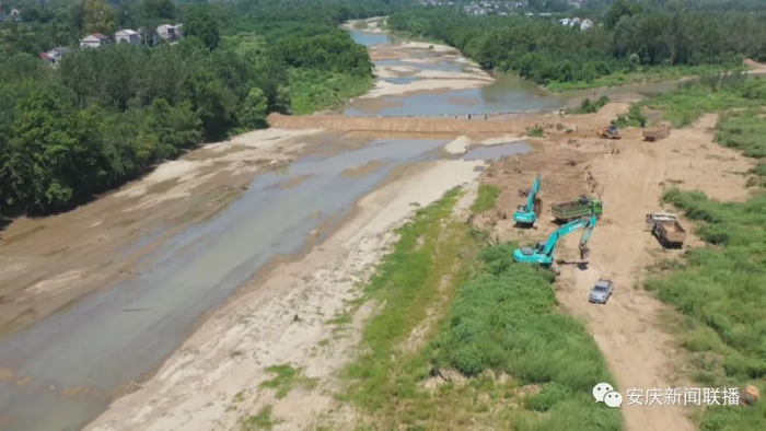 据微信公号“安庆新闻联播”8月14日消息,持续晴热高温少雨天气,造成怀宁县境内多条主干河流断流,沿线8个乡镇的农业灌溉和生活用水困难。怀宁县黄龙镇组织15台套大型机械、40多名工人,昼夜奋战,在皖水与珠流河交汇处的双河口河床上,修建拦河堰。