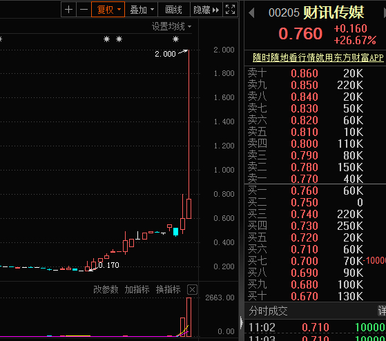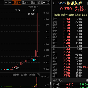 港股财讯传媒早盘一度暴涨233%至最高2港元后跳水,截至发稿时间涨幅回落至26%,报0.76港元,成交超2800万港元,市值近4.5亿港元。