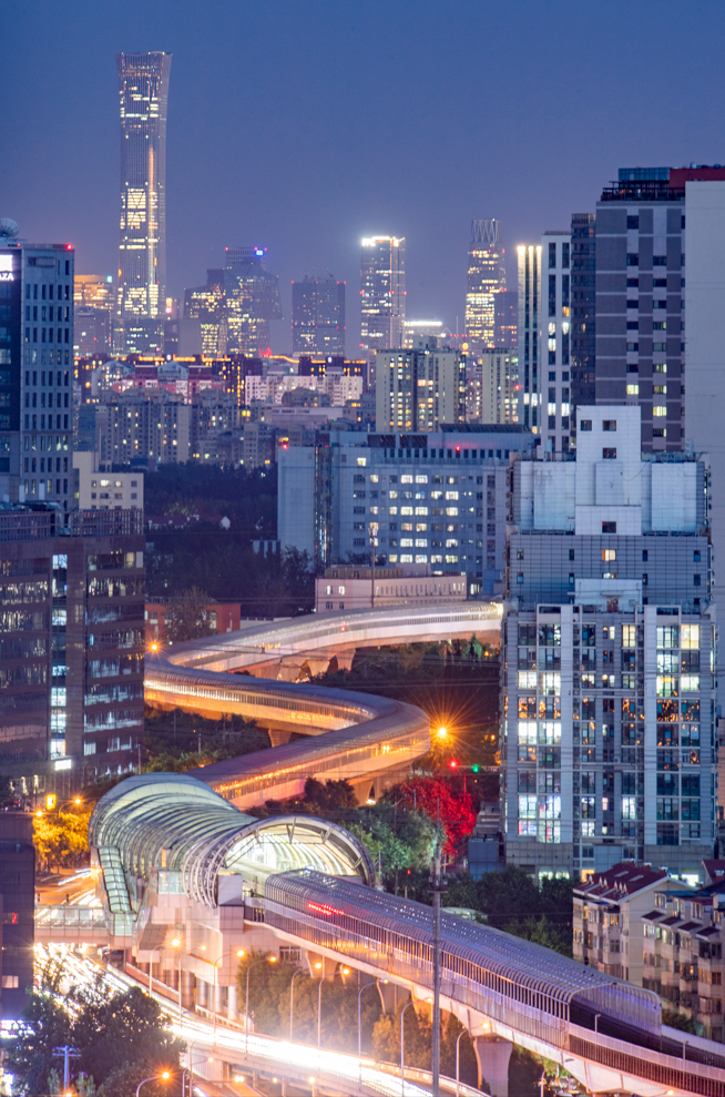 7月18日,北京,轨道交通穿梭在北京的高楼间,远处是灯火通明、经济活跃的国贸CBD。qianlong 摄/IC photo