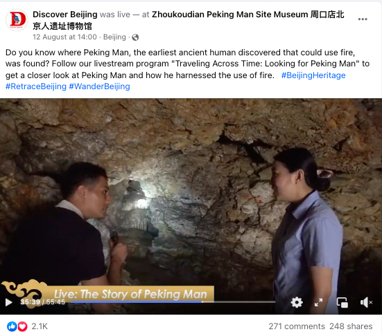 此次直播历时1小时,由中国网和周口店遗址博物馆共同举办,通过脸书、优兔、中国网英文客户端和微博同步向海内外传播。有337万海外网友通过中国网海外社交媒体平台和英文客户端收看,领略周口店遗址的风采。