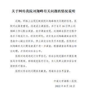 新京报讯 8月18日,中南大学湘雅二医院发布关于网传我院刘翔峰有关问题的情况说明。经初步调查,刘翔峰在医疗过程中存在不规范行为,被免职。医院将展开进一步调查。全文如下: