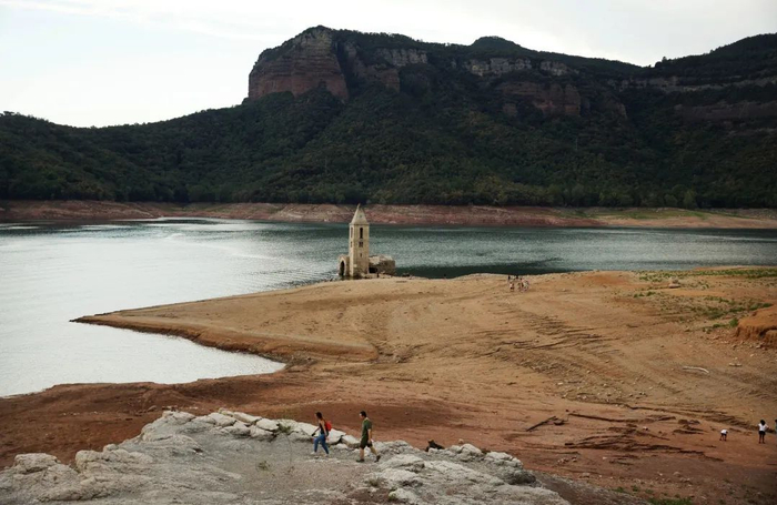 当地时间2022年8月8日,西班牙巴塞罗那北部,浮出水面的教堂遗迹吸引人们前往参观。