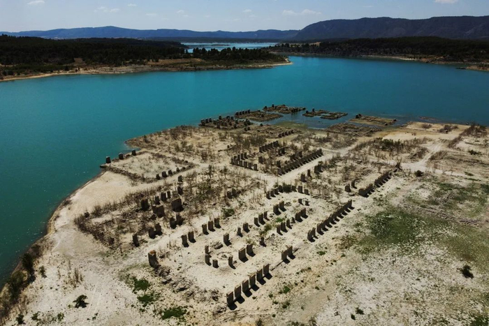 无人机镜头显示,马德里以东的布恩迪亚水库已经“触底” ,使得拉伊莎贝拉皇家浴室遗址重新浮出水面。而在巴塞罗那附近的另一座水库干涸,导致一座9世纪的罗马式教堂完好无损地裸露出来。