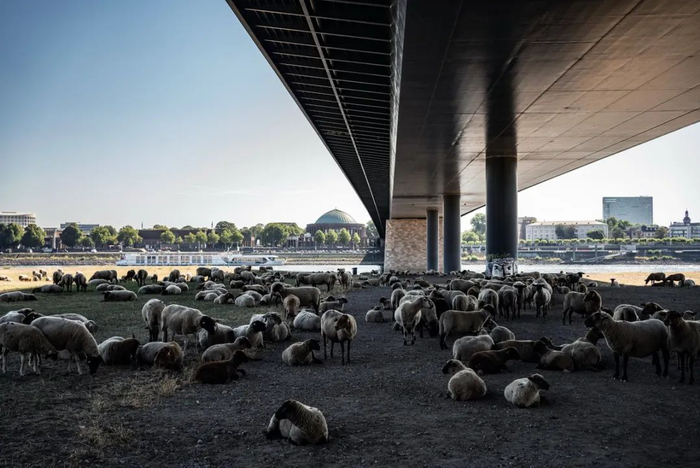 当地时间2022年8月11日,德国杜伊斯堡,莱茵河河岸上的羊群在干涸的桥下避暑。