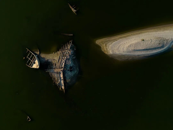 当地时间2022年7月24日,意大利塞尔米德,一艘二战沉船随着干涸的波河浮出水面。