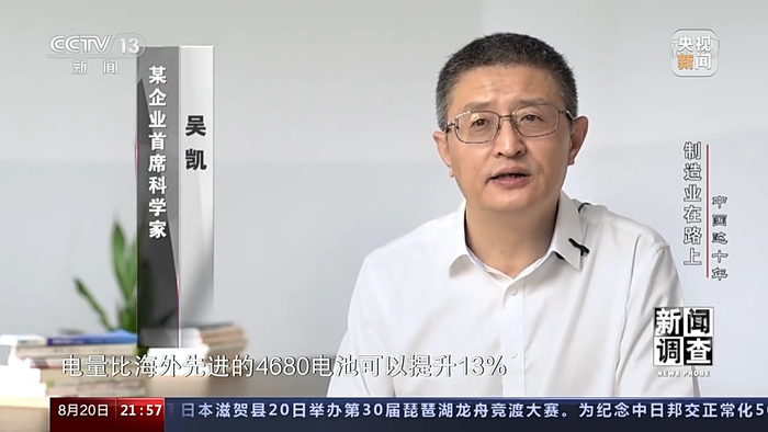某企业首席科学家 吴凯:我们推出的麒麟电池,在相同的化学体系下,同等电池包尺寸下,电量比海外先进的4680电池可以提升13%,能量密度较10年前大约提升3倍,这也意味着我们的电动汽车能跑600公里、800公里甚至更多。