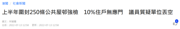 另据港媒7月报道,香港房屋局局长何永贤当时在立法会回应议员叶刘淑仪质询时表示,今年上半年在房委会辖下公屋进行250次围封强检行动,合共10%住户无应门。