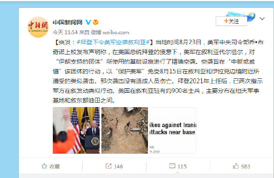 当地时间8月23日,美军中央司令部乔•布奇诺上校发布声明称,在美国总统拜登的授意下,美军在叙利亚代尔祖尔,对“伊朗支持的团体”所使用的基础设施进行了精确空袭。空袭旨在“中断或威慑”该团体的行动,以“保护美军”免受8月15日在叙利亚和伊拉克边境附近所遭受的类似袭击。那次袭击没有造成人员伤亡。拜登2021年上任后,已两次指示军方在叙发动类似行动。美国在叙利亚驻有约900名士兵,主要分布在坦夫军事基地和叙东部油田之间。