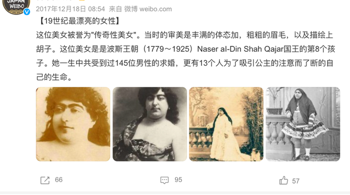 社交平台上流传一张波斯公主“法特梅哈努姆”的照片,据传她被当时的波斯政府宣布为“全波斯最美丽的女人、美的化身”。“政府还宣布,她有150多个追求者,其中13个因单相思而死去。”