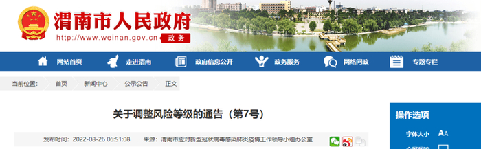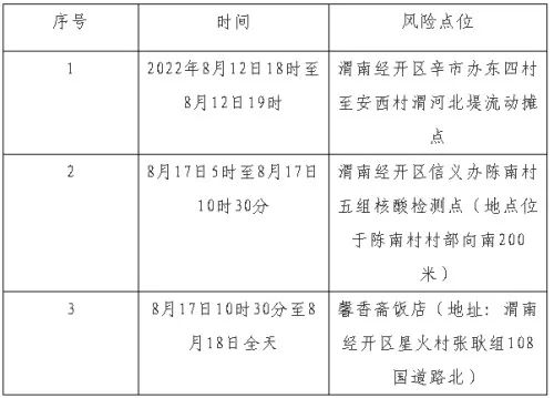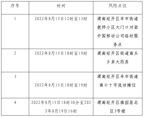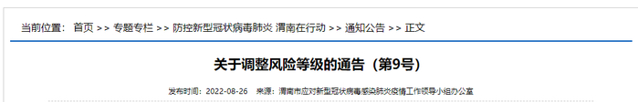 根据当前新冠疫情防控需要,按照《新型冠状病毒肺炎防控方案(第九版)》相关规定,经综合研判,渭南市应疫办研究决定,自2022年8月25日22时起,对全市疫情风险区域进行调整,现公布如下: