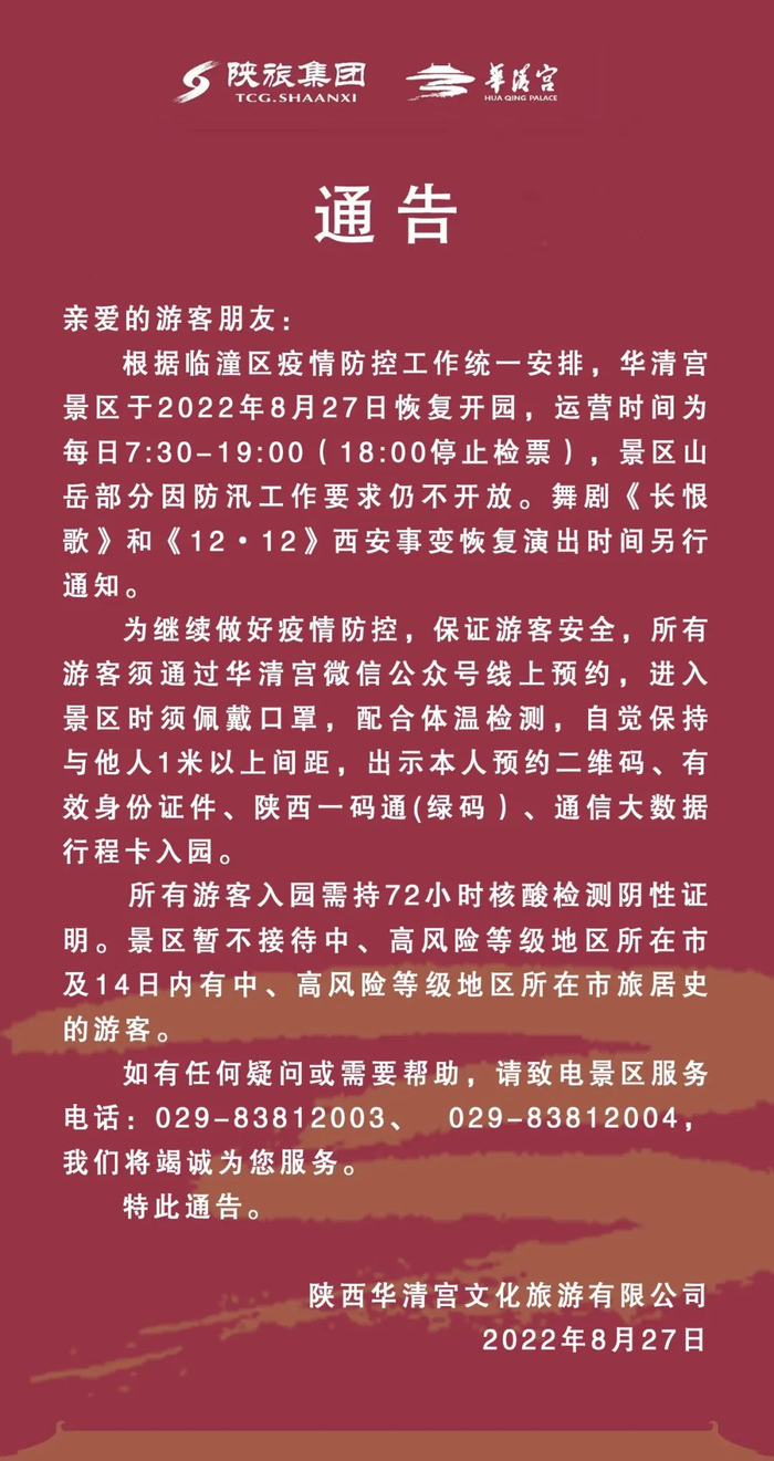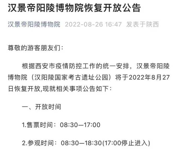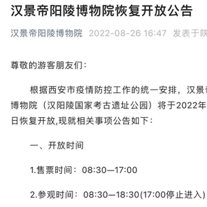 8月26日,汉景帝阳陵博物院发布公告:根据西安市疫情防控工作的统一安排,汉景帝阳陵博物院(汉阳陵国家考古遗址公园)将于2022年8月27日恢复开放。