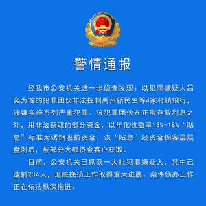 河南许昌警方:村镇银行案已逮捕234人 追赃挽损取得重大进展