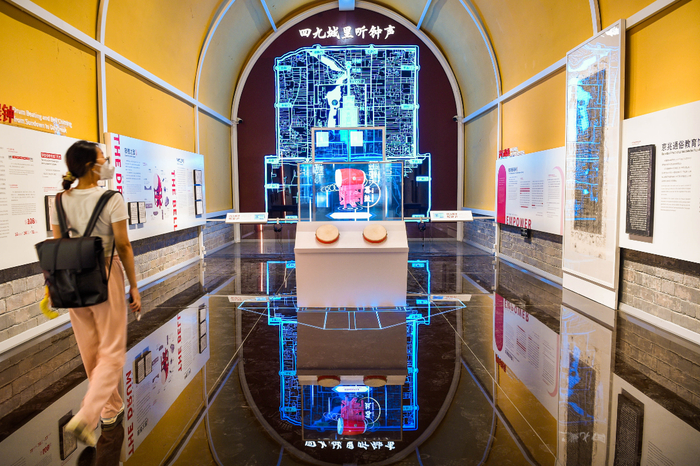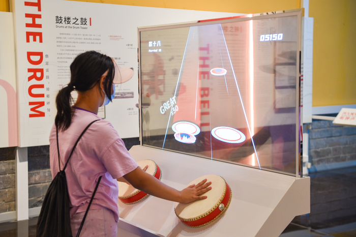 如今,古老的文化遗产焕颜迎新生。走进古色古香的鼓楼,漫步于一层重现历史原貌的7个券洞之间,一场“时间的故事”展览,以沉浸式数字展、交互体验带领观众聆听“暮鼓晨钟”的历史回响。