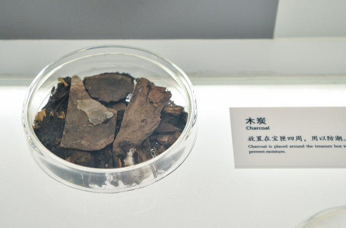 经年累月,这些“镇物”虽已泛黄或发黑,却保留完好,一旁的展示牌道出了其中秘密:它们被保存在一个铅、锌合金的宝匣中,外层又套了一个木制盒,宝匣四周还放置了木炭,用以防潮,可见古人护宝心思之细。
