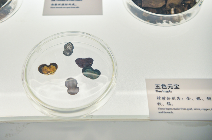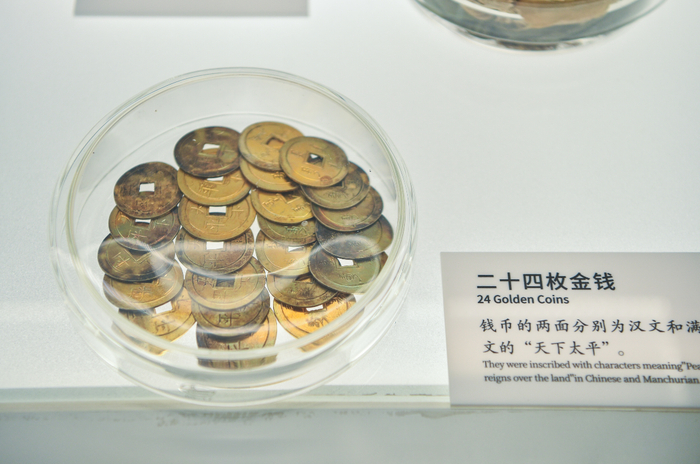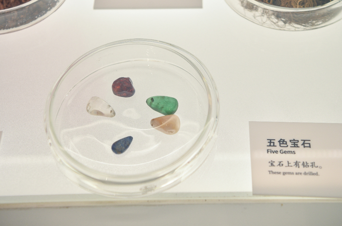 展柜里,1986年钟楼修缮时取出的“镇物”被放置在玻璃器皿中,包括五色宝石,金、银、铜、铁、锡五色小元宝,24枚两面分别刻有汉文和满文“天下太平”字样的金钱,五条有墨书“九天应元雷声普化天尊五枢宝经”字样的绸带,以及五色丝线、绢和五谷杂粮。