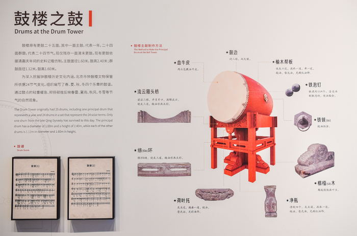 钟鼓楼由碑漏、铜刻漏、时辰香计时,击鼓定更、撞钟报时构成完整的报时系统。在六百多年的报时历史中,钟鼓楼始终沿用先击鼓后撞钟,即每日报时始于“暮鼓”、止于“晨钟”的报时方式。专家介绍,元代、明代的报时方法现无考证,清初报时方法为报五更,定更(一更)和亮更(五更)皆先击鼓后撞钟,钟、鼓均敲108声,二更至四更则只撞钟不击鼓。乾隆后改为只在夜间报定更和亮更两次,每晚定更后,司鼓校尉以“对灯”为号,钟声响城门关,交通断,称“净街”。这时,皇宫乃至京城大小街道的更夫,手拿铜锣、梆子和护身用的器具开始值夜,以报时和守护都城的安全。通过展板,观众可以了解鼓楼25面更鼓和钟楼大钟的构造,以及历史上钟鼓楼统领城门开启的功能、历代为钟鼓楼工作的人等内容。