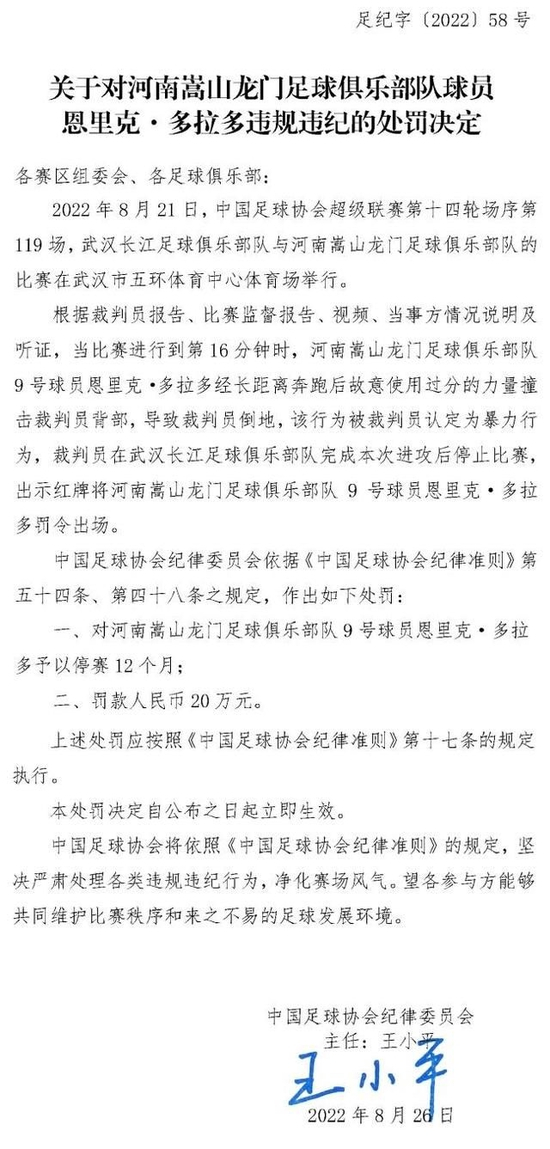 此前中国足协发布处罚决定,针对中超第14轮河南嵩山龙门队外援多拉多在比赛中撞翻裁判马宁被红牌罚下一事进行追加处罚——多拉多被禁赛12个月,罚款20万元,