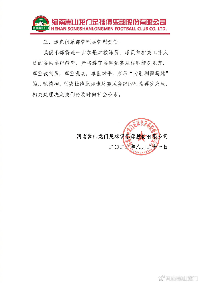 本赛季我俱乐部有多名球员出现违反赛风赛纪的行为,这些行为严重影响了河南足球的形象,造成了不良的社会影响。在此,我们向支持足球事业发展的各界人士表示诚挚的歉意。