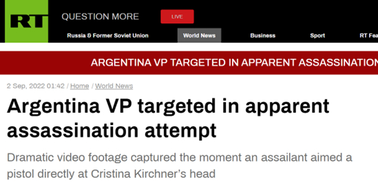 阿根廷经济部长塞尔吉奥·马萨是第一批对此事做出反应的官员之一,他在推特上谴责了这次袭击,“当仇恨和暴力凌驾于思想的辩论之上时,它们就会破坏社会,造成今天这样的情况:企图暗杀,”他还称自己与副总统及其家人“团结一致”,同时表示希望将袭击者绳之以法。