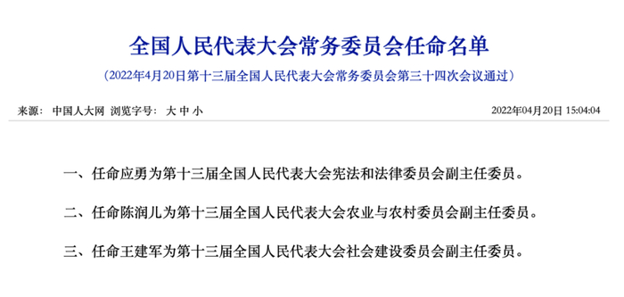 2022年4月20日,第十三届全国人民代表大会常务委员会第三十四次会议通过任命名单,任命应勇为第十三届全国人民代表大会宪法和法律委员会副主任委员。
