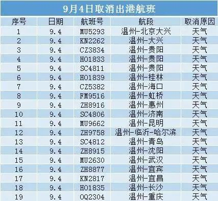据温州发布,受台风影响,温州机场于2022年9月4日10:37启动防汛防台应急预案三级响应,截至9月3日23时,因天气原因取消的航班如下: