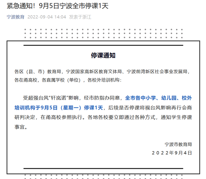 据央视新闻报道,受第11号台风“轩岚诺”影响,宁波、舟山、温州教育局发布紧急通知,受超强台风“轩岚诺”影响, 全市各中小学、幼儿园、校外培训机构于9月5日(星期一)停课1天,后续是否停课将视台风影响再行会商研判决定。