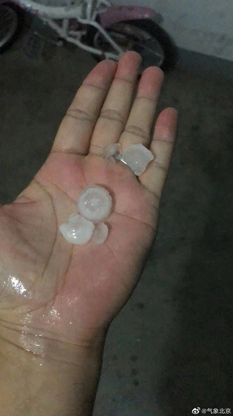 昨天傍晚,京城一时狂风呼啸,电闪雷鸣,多地狂风骤雨,“大珠小珠落玉盘”,落了一地的冰雹。不少网友晒出了冰雹的图片,有些直径有2厘米,有些冰雹像玉米粒大小铺了一地。还有的网友抱怨冰雹把自己的车砸出好几个小坑。