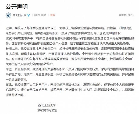 @西北工业大学 6月22日发布公开声明,近期,该校电子邮件系统遭受网络攻击,对学校正常教学生活造成负面影响。该校第一时间报警,经公安机关初步判定,是境外黑客组织和不法分子发起的网络攻击行为。