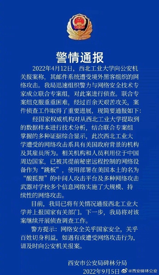 西安碑林公安通报西工大遭境外网络攻击