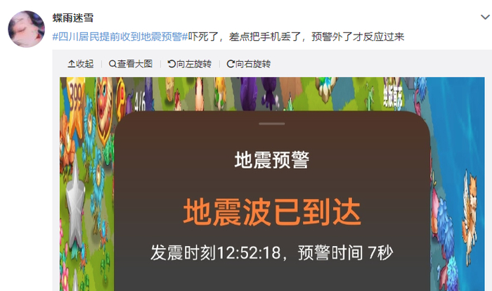 四川成都,网友家中吊灯摇晃。四川居民提前收到地震预警