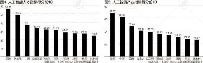 从报告总体排名看,2021年全球人工智能创新指数仍呈现明显的梯次分布。46个参评国家分为四大梯队:进入第一梯队的只有美国和中国;第二梯队包括韩国、英国等9个国家;第三梯队包括瑞典、卢森堡等13个国家;第四梯队有印度、俄罗斯等22个国家。