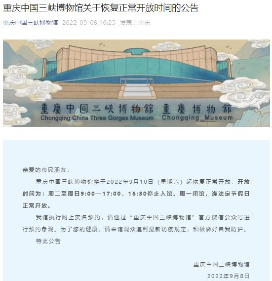9月8日,重庆中国三峡博物馆微信公众号发布消息称,三峡博物馆将于9月10日(星期六)起恢复正常开放,开放时间为:周二至周日9:00—17:00,16:30停止入馆。周一闭馆,逢法定节假日正常开放。