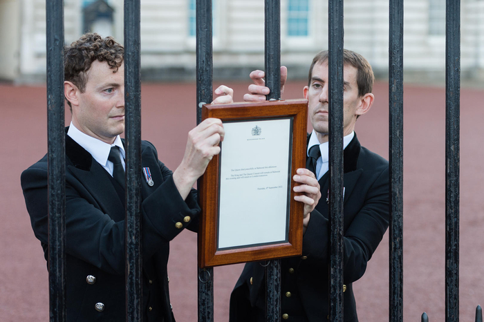 英国当地时间9月8日,一名身着黑色衣服的男仆在白金汉宫的大门上贴了一张官方通告。
