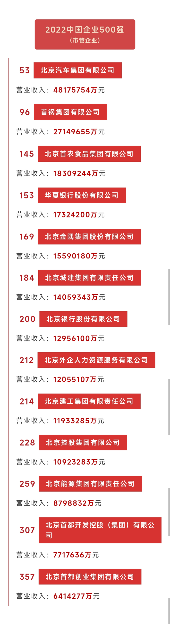 首农食品集团、华夏银行、金隅集团、城建集团、北京银行、外企集团、建工集团、北控集团年营收均在1000亿元以上,在榜单分列第145位、153位、169位、184位、200位、212位、214位、228位。京能集团、首开集团、首创集团较去年名次分别提升42位、69位、18位,在榜单排名分列第259位、307位、357位。