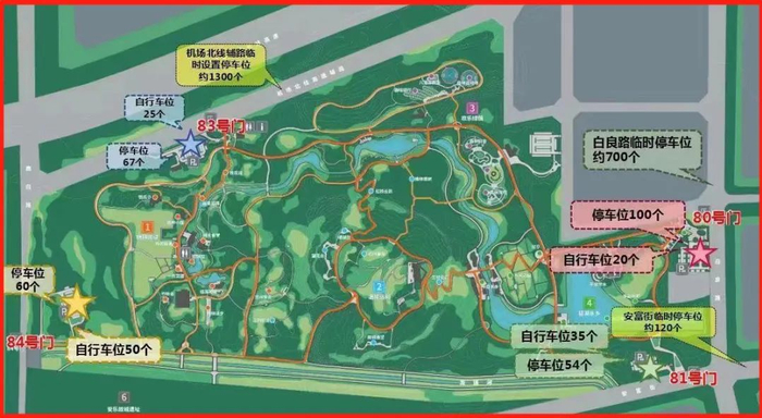 园区开放了4个出入口并对应配备停车场,在原有280个停车位的基础上,在园区北侧及东侧道路设置临时车位2000余个。同时,园区已完成对接高德地图应用对接,以便游客能快速方便停车,提升游客体验满意度。