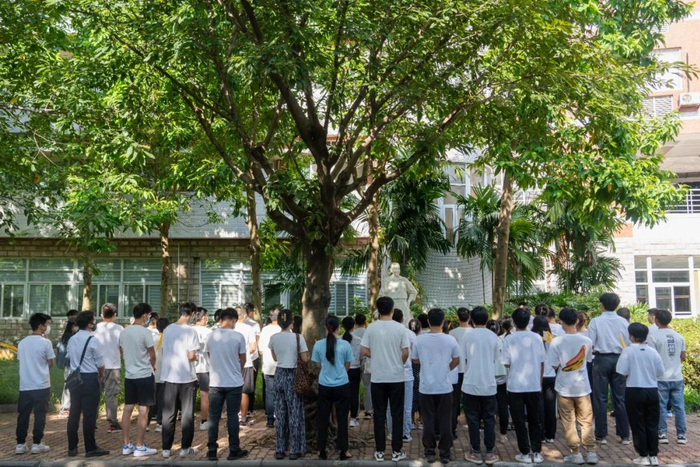 教师节前夕,华南农业大学师生自发来到丁颖、卢永根院士雕像前敬献鲜花。(华南农业大学供图)
