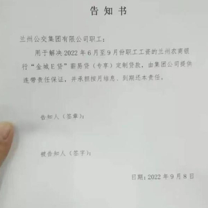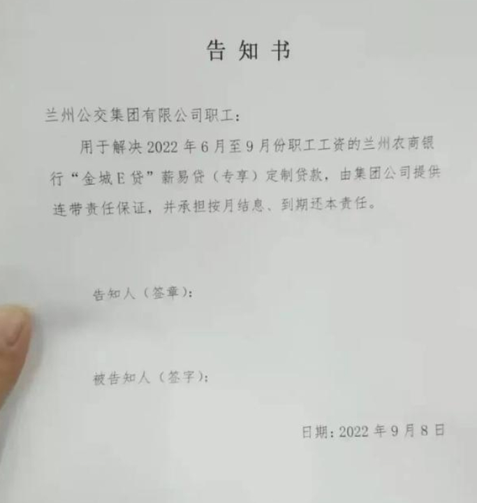 近日,网传一张“兰州公交集团有限公司职工”的告知书,要求兰州公交集团有限公司职工向兰州农商银行贷款,以此发放职工工资,公司提供连带责任保证。9日,兰州公交集团宣传部工作人员向媒体记者证实,此告知书属实。10日,北京铭盾律所胡晓锋律师告诉上游新闻(报料邮箱baoliaosy@163.com)记者:“一旦兰州公交集团无法连带偿还,劳动者不自行清偿履行判决,就会面临被法院列为失信被执行人的风险。”