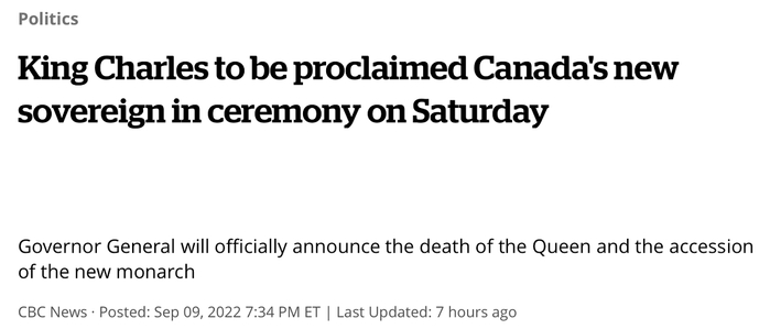 加拿大广播公司称,加拿大总督玛丽·西蒙将在该国官方报纸《加拿大宪报》上发布公告,正式宣布英国女王去世和新君主的登基。