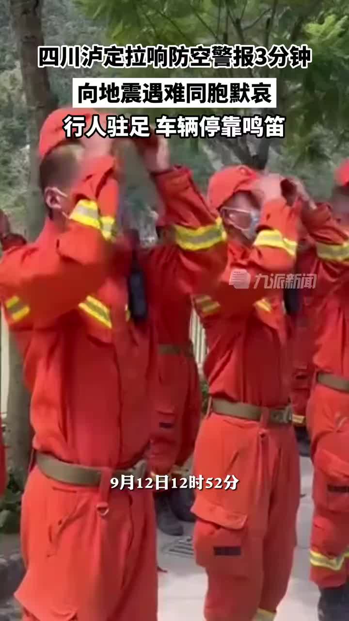 9月12日12时52分,四川 泸定拉响防空警报向地震遇难同胞默哀,行人驻足,车辆停靠鸣笛