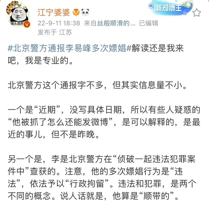 9月11日18:38,微博大V江宁婆婆发布微博,从法律的角度解读李易峰嫖娼被行拘案。
