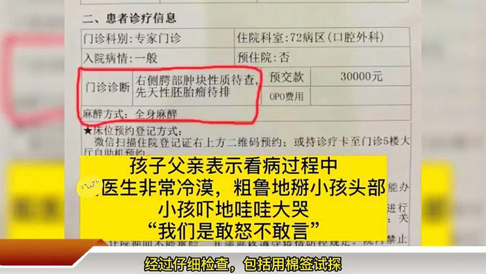 根据家长提供给媒体的病历单来看,医生在病历上下的初步诊断是“右侧颚部肿块性质待查?先天性胚胎瘤待排?”,并且打上了两个问号,并没有直接确诊。