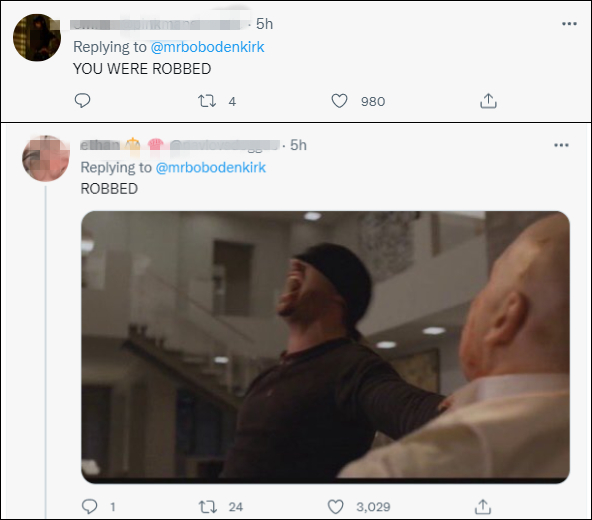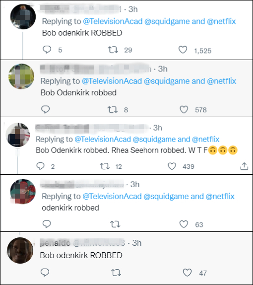 在艾美奖官宣李政宰获奖的推特下方,许多外国网民刷起了“Bob odenkirk ROBBED”,称奥登科克的奖被“抢”了。