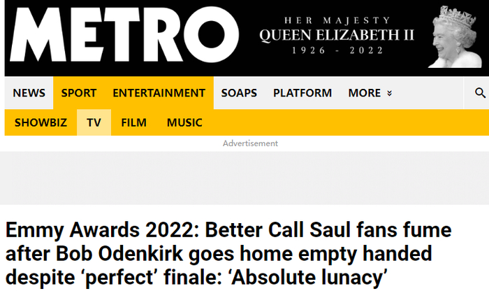 奖项颁出后,不少美媒报道了李政宰“创造历史”的获奖消息,但英国都市报(Metro)网站发现,推特上的《风骚律师》剧迷气坏了,都在为鲍勃·奥登科克鸣“不平”。