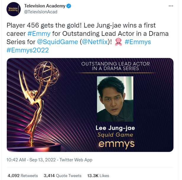 李政宰凭《鱿鱼游戏》成艾美奖“视帝”,《风骚律师》剧迷:奥登科克的奖被“抢”了