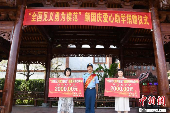中新网漳州9月14日电 (戴伟国 张琳 简佳颖)近日,全国见义勇为模范、东部战区空军某场站场务连班长颜国庆回到家乡漳州,将获得的10万元奖金全部回馈社会。其中9万元捐赠母校漳州三中、漳州五中、漳州市语堂小学,1万元捐赠给四川甘孜州红十字会,用以资助所在校贫困学生以及四川地震受灾民众。漳州市退役军人事务局、芗城区人武部、漳州市烈士纪念设施保护中心、漳州三中、漳州五中党员干部、师生代表参加捐赠仪式。