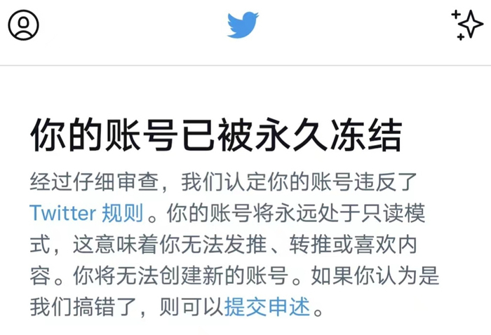 而极具讽刺意味的是,就在截稿前,爱丽克斯在12日最新注册的推特账号再次显示被冻结,她查看后发现推特对其账号进行了“永久冻结”。