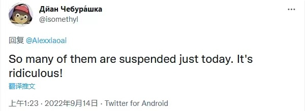 但没过多久,就在中秋节的前一晚(9日),爱丽克斯发现自己的推特账号突然被封号了,她接连几天向平台官方申诉也都石沉大海,音信全无。