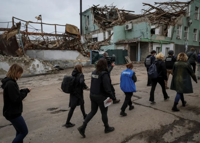 当地时间2022年9月13日,乌克兰哈尔科夫州巴拉克列亚,乌克兰军队夺回战略城镇巴拉克列亚后,媒体记者在街头行走。图/IC photo