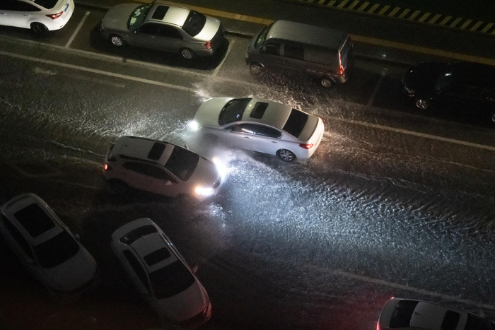 8月4日晚,北京市处在暴雨蓝色预警中,常营地区雨量变大,车辆通过路面时激起水花。图/IC photo